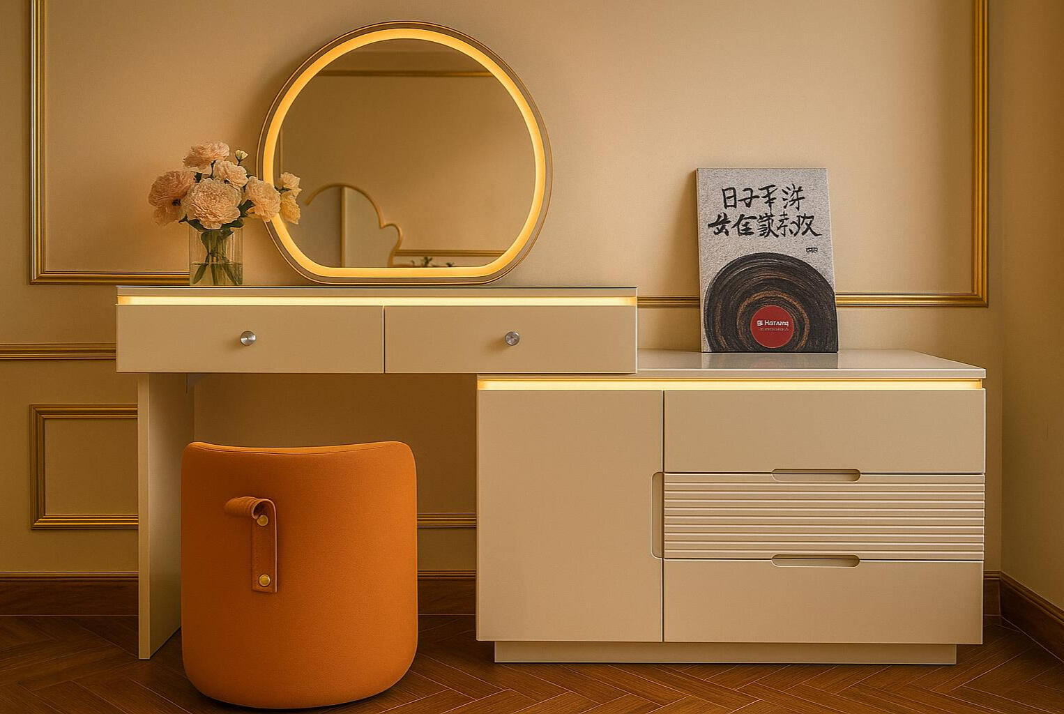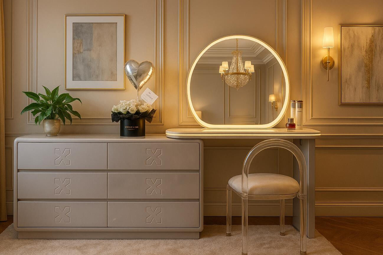 A modern vanity table set featuring a round LED mirror, clean lines, and coordinated storage drawers. Warm lighting and refined detailing create a stylish, elegant look perfect for contemporary bedrooms.