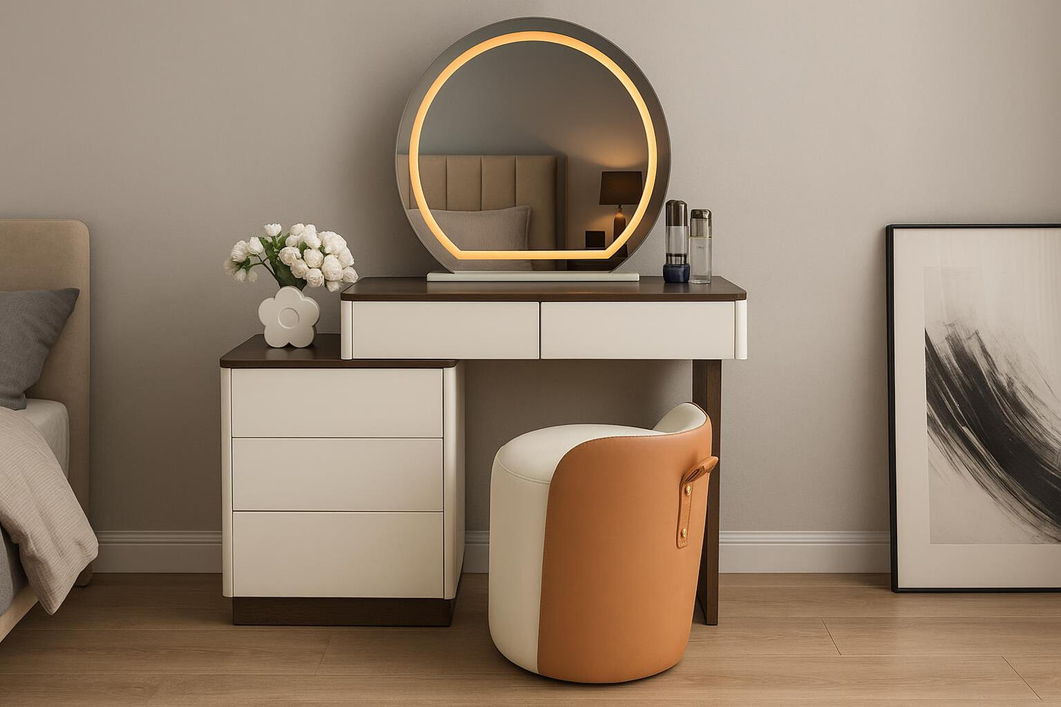 A clean modern vanity set featuring a round LED mirror, a minimalist dresser with wood-accented handles, and a soft cushioned stool. Its simple lines and warm tones create a fresh, elegant look ideal for contemporary bedroom spaces.