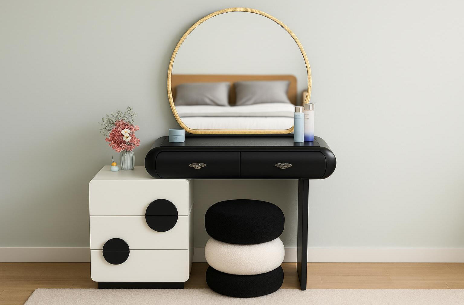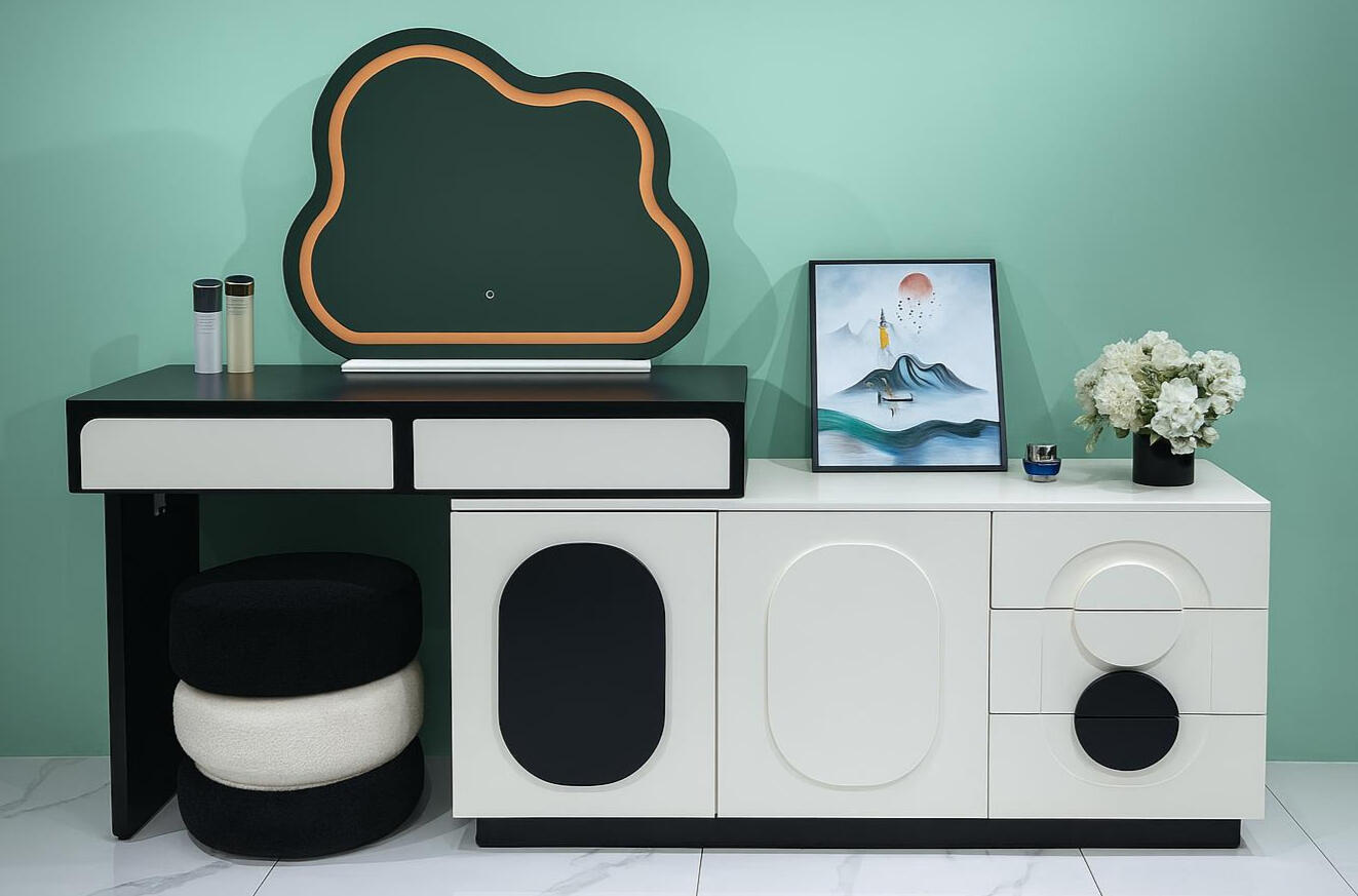 A modern designer vanity set featuring a playful cloud-shaped mirror, a sleek black tabletop, and a geometric storage cabinet. Its bold shapes and contrasting colors create a unique contemporary look—perfect for stylish, youthful, and creative interiors.