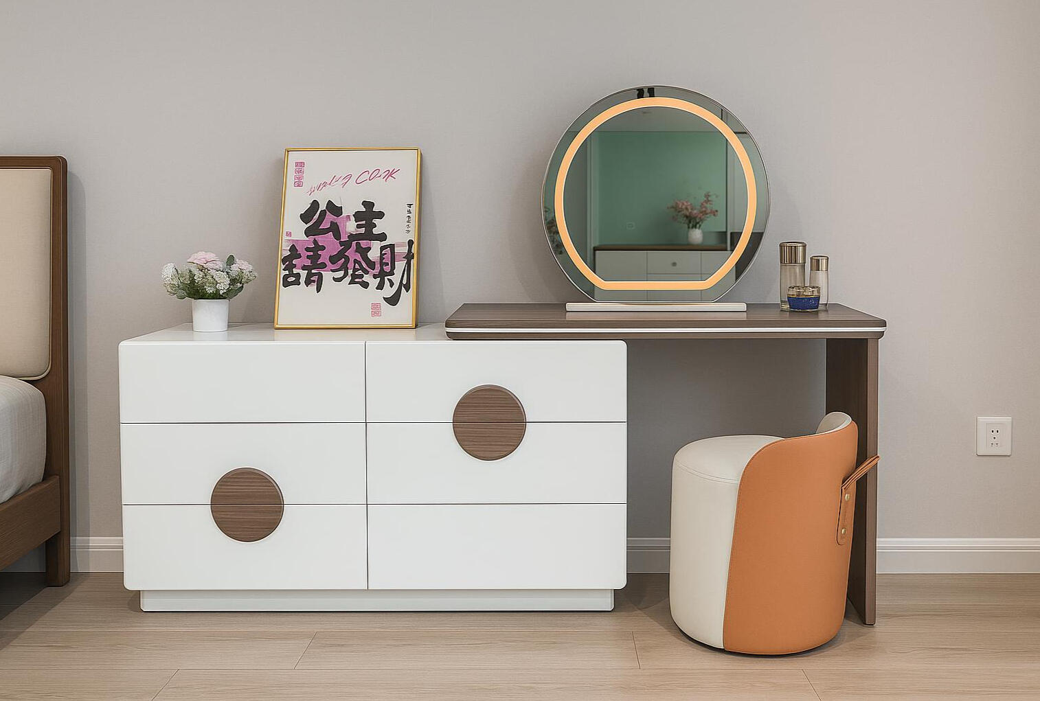 A clean modern vanity set featuring a round LED mirror, a minimalist dresser with wood-accented handles, and a soft cushioned stool. Its simple lines and warm tones create a fresh, elegant look ideal for contemporary bedroom spaces.